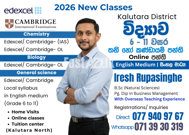 Individual home visits (Kalutara to Horana) and online classes. Tuition Centre at Kalutara North (CCTV-secured).