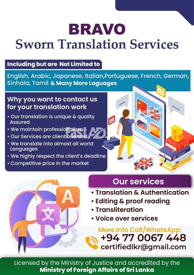 English, Arabic, Japanese, Italian, Korean, French, German, Sinhala, Tamil and many more Languages