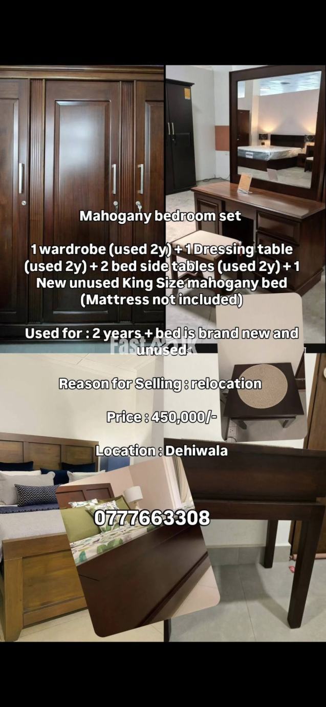 1 wardrobe (used 2y) + 1 Dressing table (used 2y) + 2 bed side tables (used 2y) + 1 New unused King Size bed (Mattress not included)